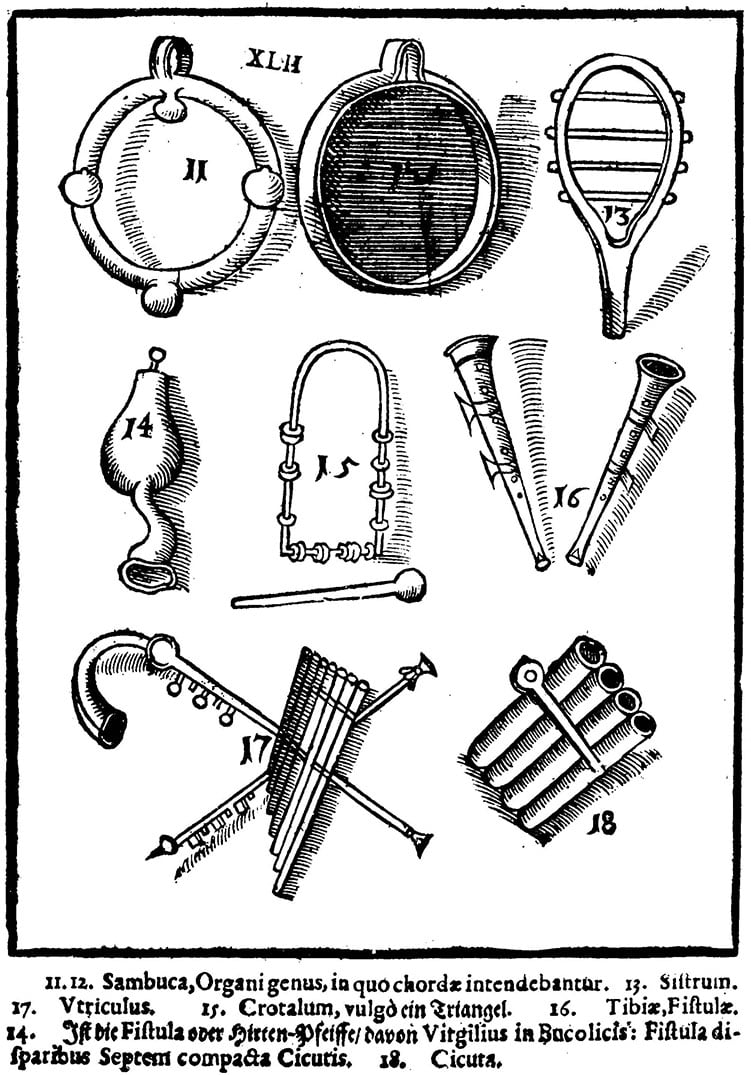 Il Syntagma musicum del 1619 (sýntagma significa schieramento, disposizione), scritto dal compositore e teorico Michael Praetorius, comprendeva una sezione intitolata Organographia. Il trattato era riccamente illustrato e alternava passi in tedesco e in latino (come nella didascalia originale riportata sotto l’immagine) dal momento che i fabbricanti di strumenti e i suonatori non avevano familiarità col latino.